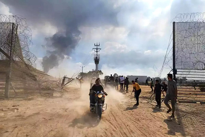 Terrorists breach the Gaza border fence on Oct. 7, 2023. Photo courtesy of Israel Hayom.