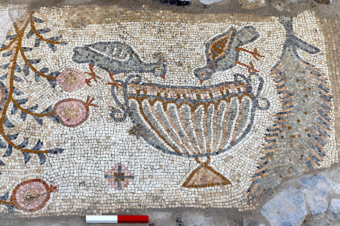Birds drink from a chalice depicted on the mosaic. Photo courtesy of Michael Eisenberg.