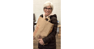 Shalom Food Pantry Volunteer Ellen Weinstein with a bag of supplies for those facing financial strain.