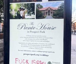 Promotional sign for The Picnic House wedding venue in Prospect Park, showing photos of a couple and the historic building. Large red graffiti scrawled at the bottom reads: FUCK ISRAEL. Photo courtesy of Hana Schank