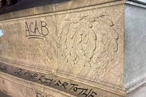 A close-up of a historic stone monument base (likely the Marquis de Lafayette statue pedestal in Brooklyn) with engraved text and decorative leaf motifs. Bold black graffiti is scrawled across it: ACAB prominently in the center, plus FROM THE RIVER TO THE SEA along the lower edge. Photo courtesy of Hana Schank