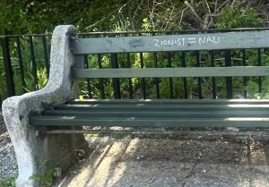 A weathered green metal park bench in a leafy, secluded spot has crude white graffiti scrawled across its backrest: ZIONIST = NAZI. Dense greenery and a black fence form the background. No people are visible. Photo courtesy of Hana Schank